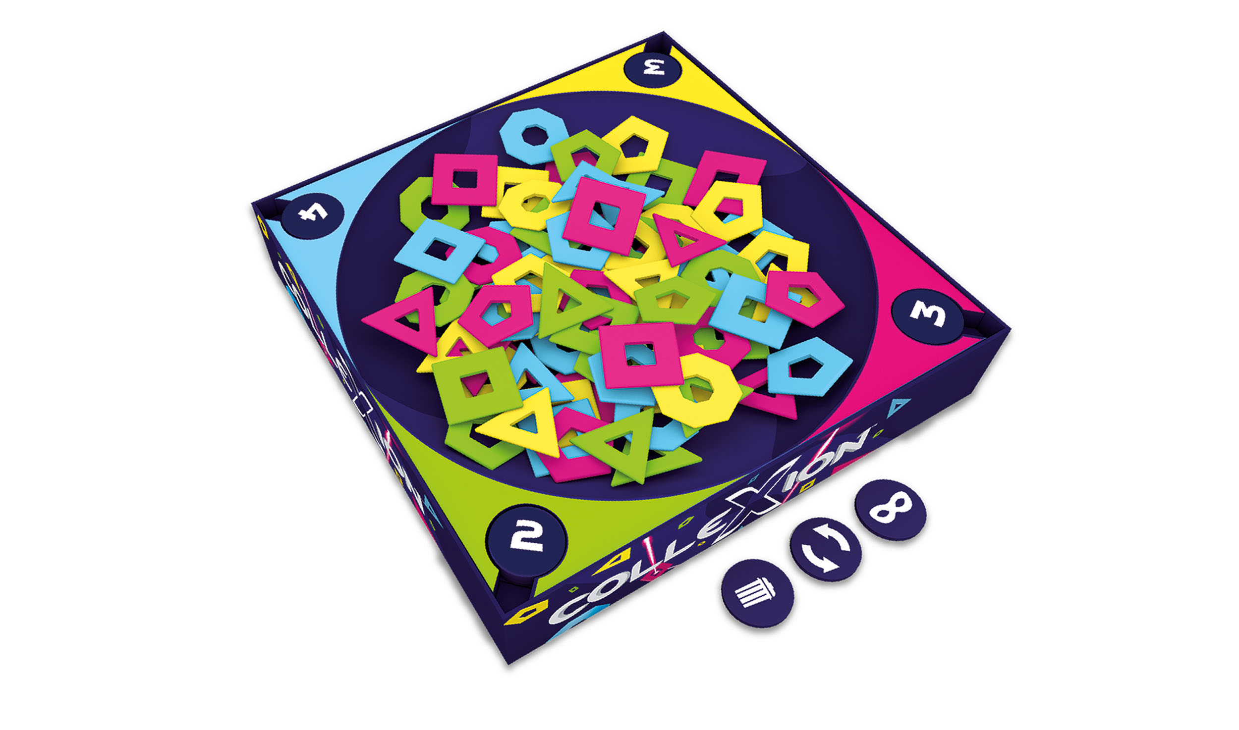 Wer hat die Drei-, Fünf- und Achtecke fest im Blick und erkennt auch das passende Quadrat? Mit Konzentration und scharfem Blick lässt sich beim neuen Familienspiel von Antoine Bauza eine punktebringende „ColleXion“ bilden. Ziel des Spiels ist es nämlich, verschiedene Polygone aus der Spielschachtel zu Form- oder Farbsets zusammenzusetzen und damit wertvolle Punkte zu ergattern. Dabei gilt: Je später die Spieler die Sets bilden, desto wertvoller werden diese. Übrig gebliebene Formen sorgen allerdings für Minuspunkte. Und nicht zu vergessen, auch die Mitspieler sind fleißige Sammler, denen man nicht allzu oft eine Vorlage bieten sollte. Am Ende des Spiels gewinnt, wer die meisten Punkte erzielen konnte.