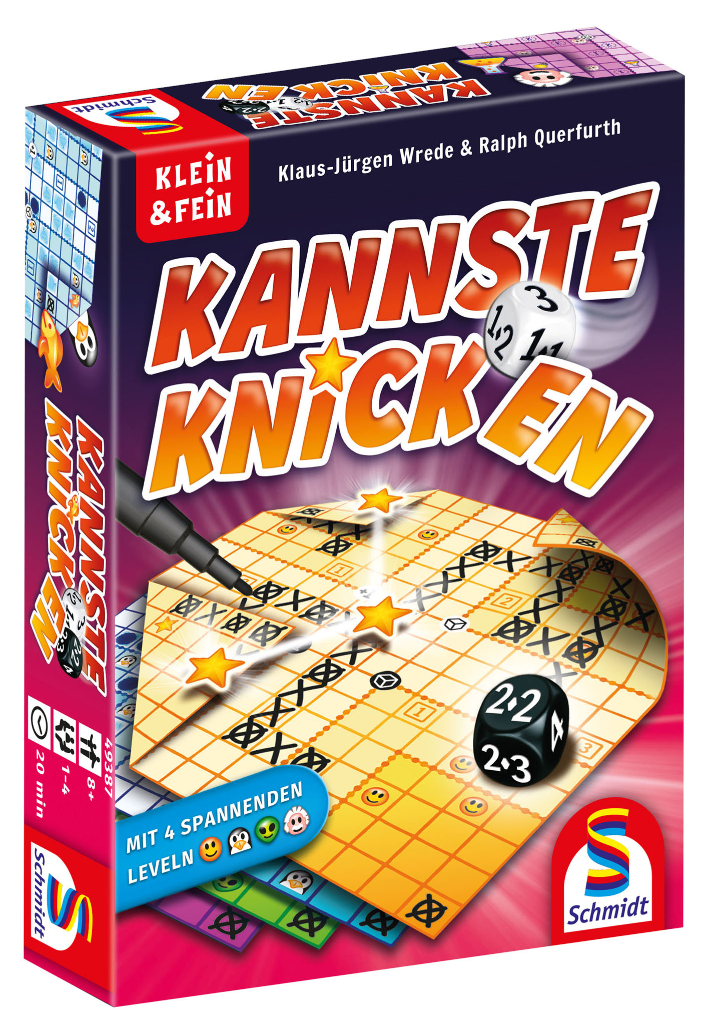 Alle Ziele mit einem Wegenetz aus Kreuzen verbinden – wer das auf seinem Spielblatt zuerst schafft, geht bei „Kannste knicken“ als Gewinner hervor. Klingt einfach? Sicher, wenn sich bloß nicht eine Vielzahl der Ziele auf der Blattrückseite befänden. Um diese mit den Kreuzen zu erreichen, müssen die Spieler ihre Würfelergebnisse clever einsetzen und die Ecken ihres Blattes knicken – immer mit dem Fortschritt der Mitspieler im Blick. Denn nur der Schnellste gewinnt die Partie. Mit dem neuen Roll & Write Spiel von den Erfolgsautoren Klaus-Jürgen Wrede und Ralph Querfurth erweitert Schmidt Spiele die beliebte „Klein & Fein“-Reihe.